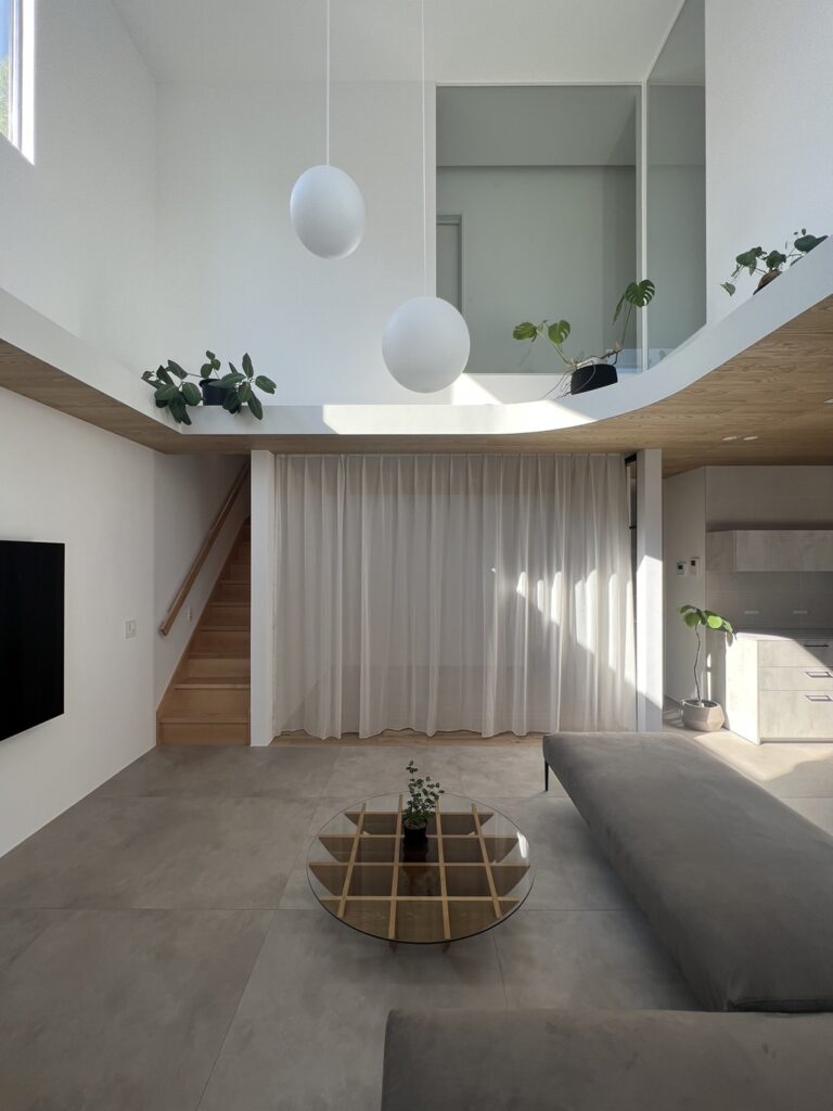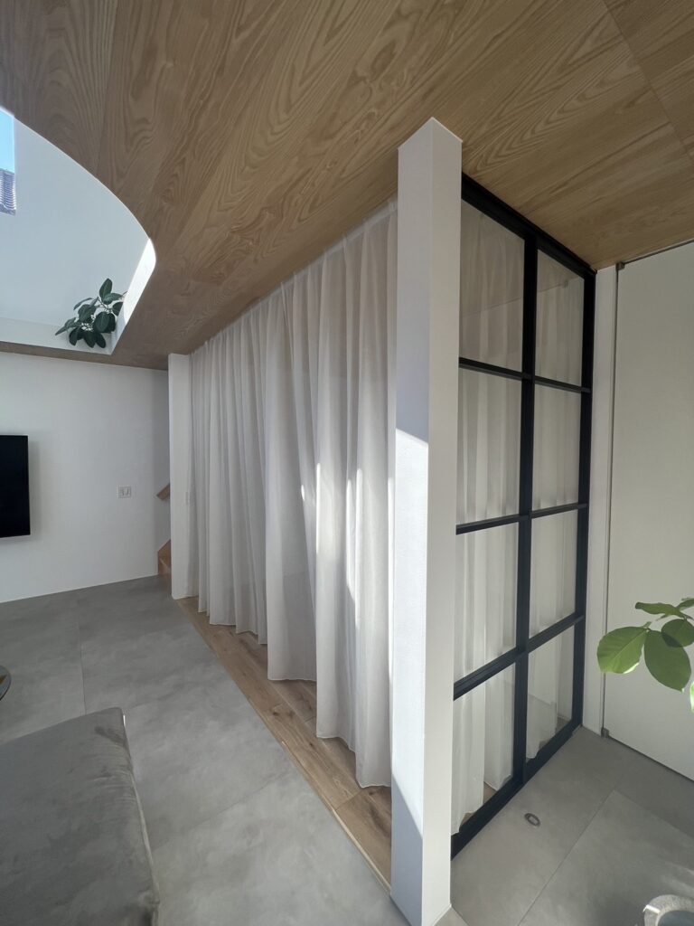 LDKと多目的スペースの間を、緩やかに仕切ってくれるレースカーテンです。